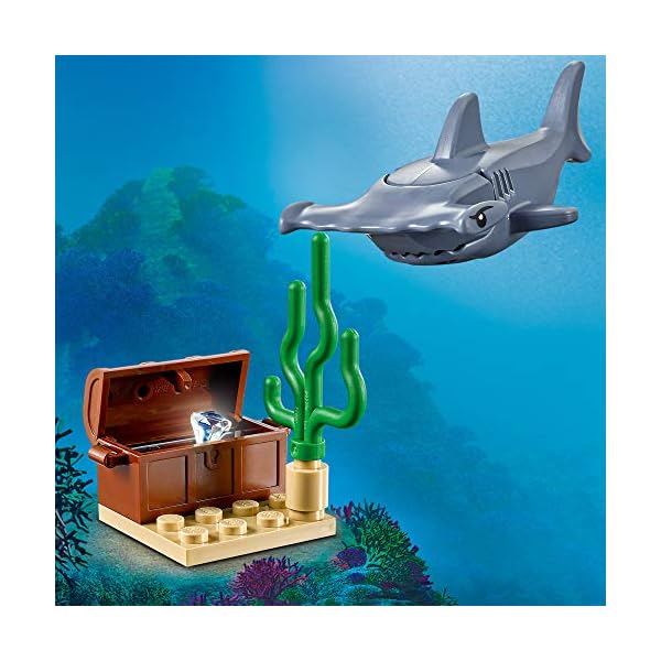 Il set comprende la minifigura LEGO del pilota, nonché uno squalo martello grigio con mascelle apribili che nuota attorno ai coralli e allo scrigno