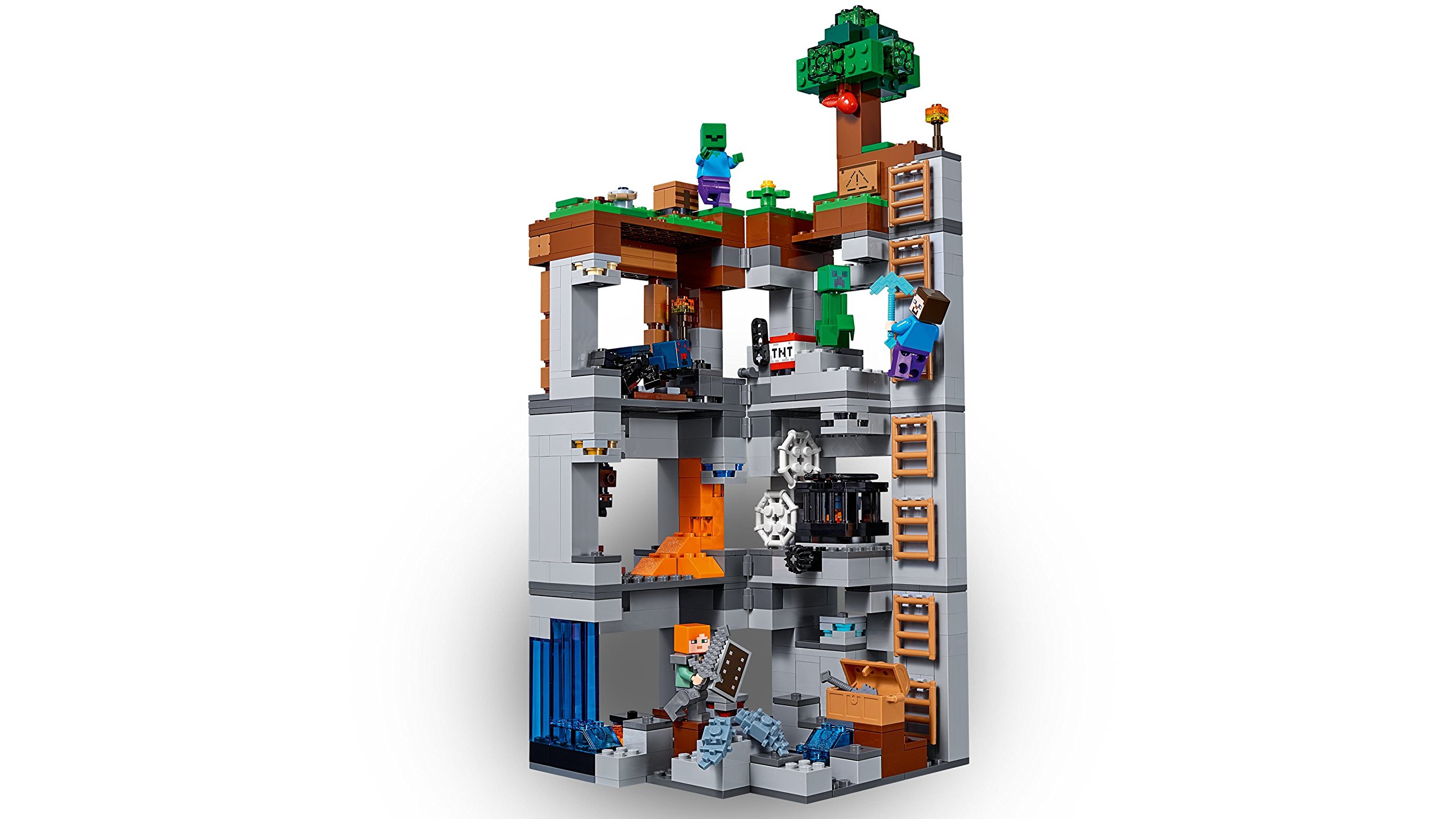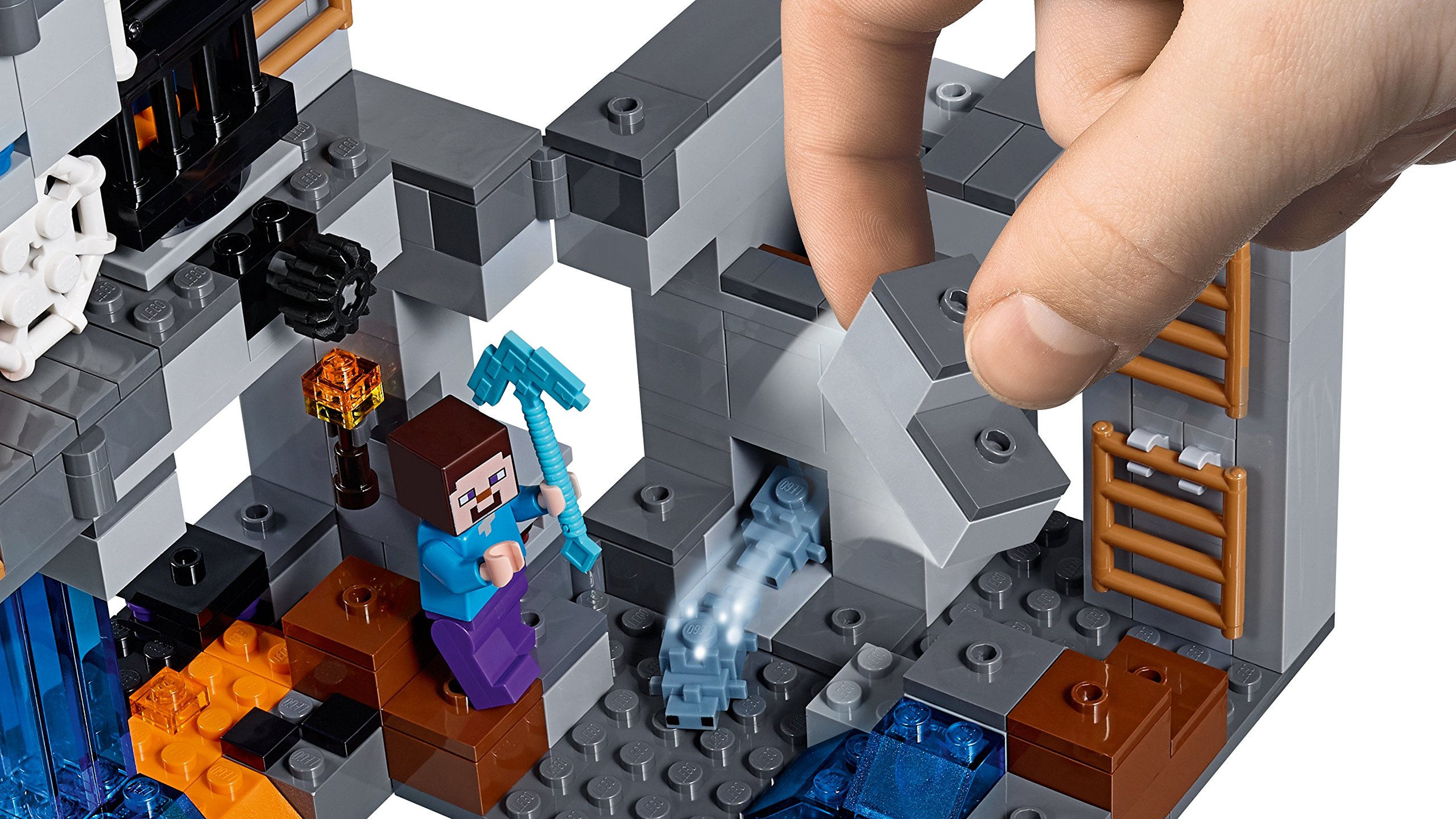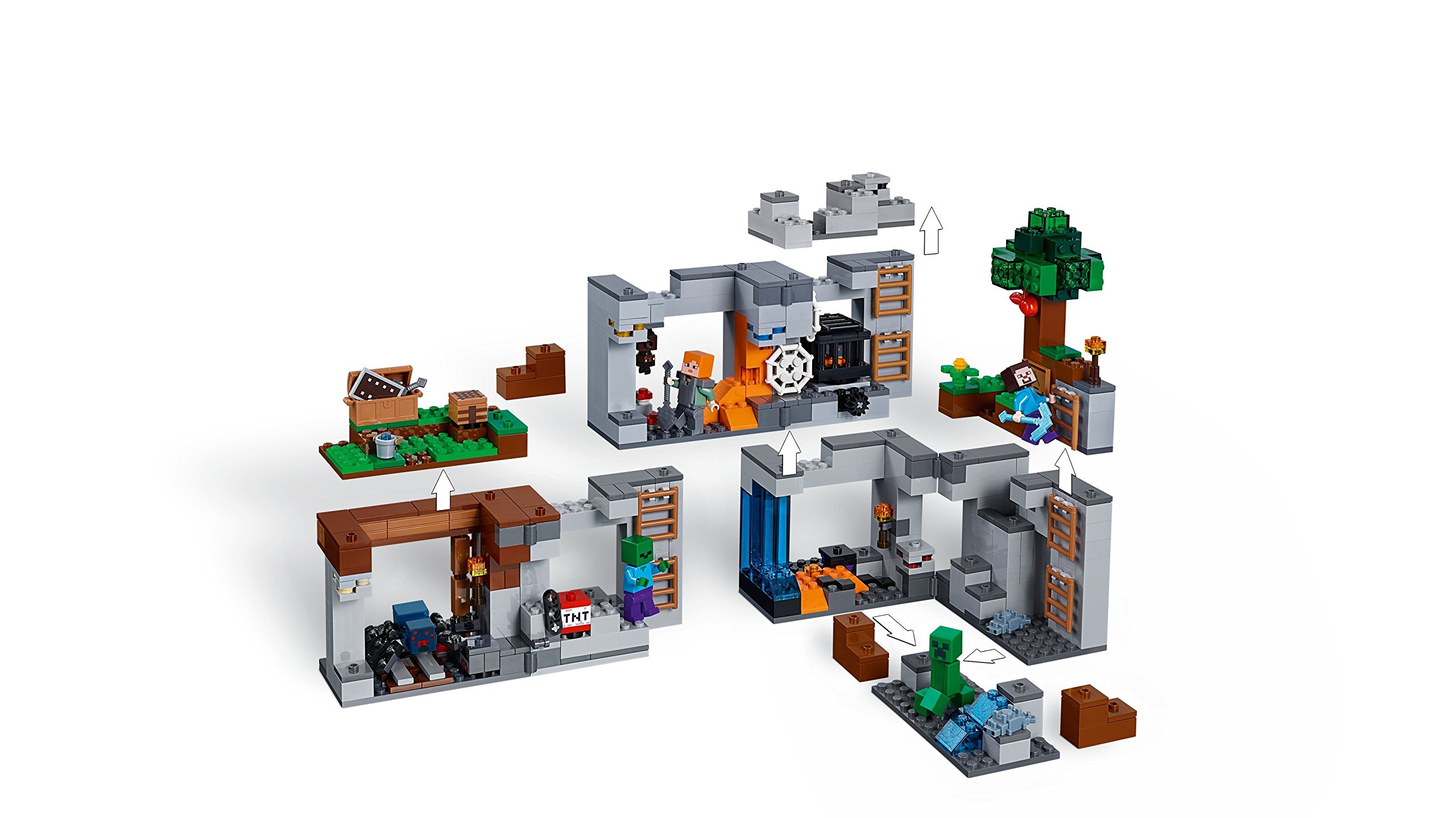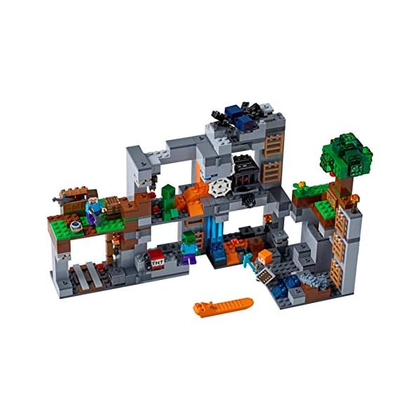 Contiene un’ambientazione Lego Minecraft costruibile con Overworld, miniera e livelli di bedrock collegati da una serie di scale, oltre a uno spawner di ragni delle caverne girevole, funzione di esplosione della dinamite, funzione di spawning di pesciolini d’argento, albero, ragnatele, funghi, ossidiana, lava e cascate, e 7 minerali