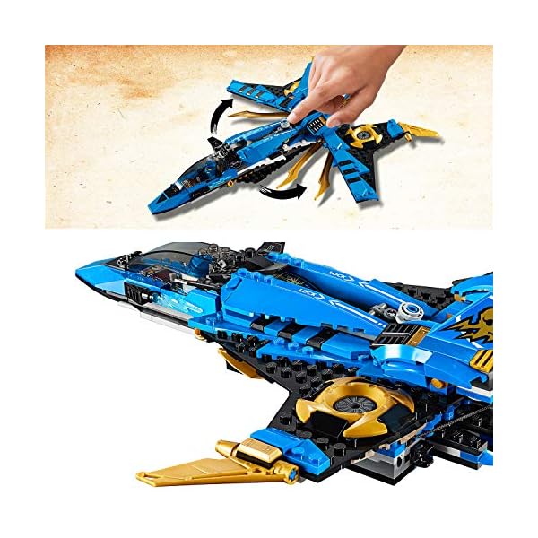 Il jet da combattimento di Jay è dotato di cabina di pilotaggio per minifigure apribile con compartimento di stivaggio, 2 shooter a molla, ali e lame d’oro apribili