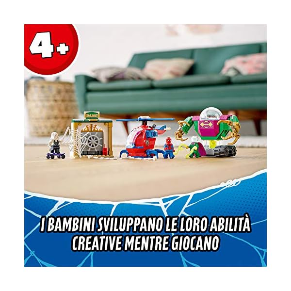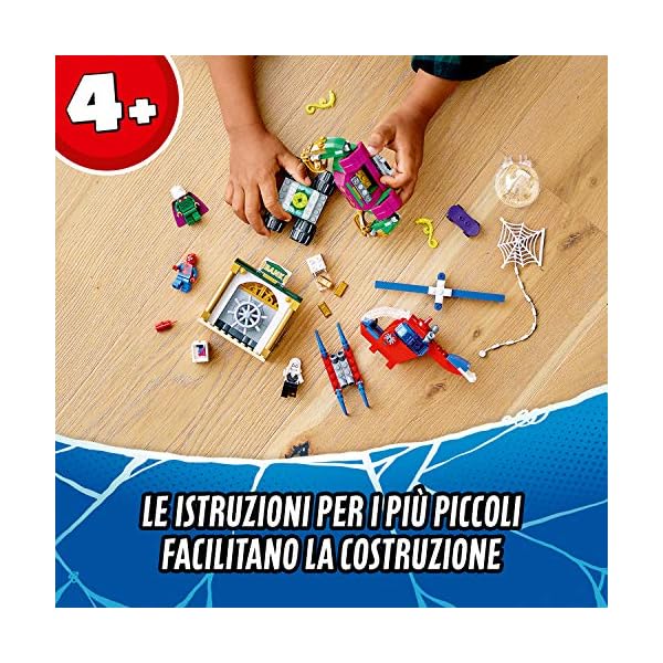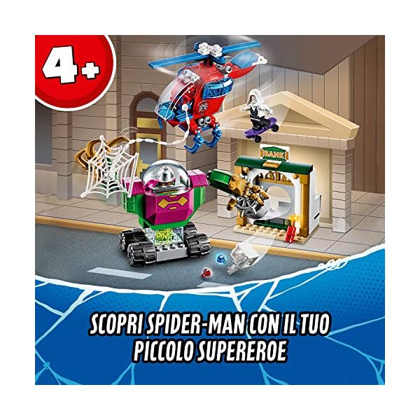 Questo giocattolo contiene Spider-Man, Ghost Spider, la minifigure di Mysterio, l’elicottero di Spider-Man, il mech di Mysterio e una banca che si apre per rivelare la camera di sicurezza giocattolo